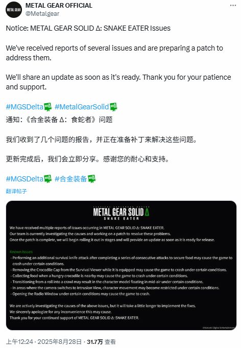 九游体育随着数字豪华版游戏的提前解锁,《合金装备3:重制版》在所有平台上均遭遇了显著的性能问题。开发商Konami已通过社交媒体正式回应九游体育,确认已意识到这些问题,并表示一个修复补丁正在准备中。