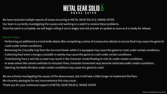 Konami在声明中写道:“我们收到了大量关于游戏问题的报告,我们的团队正在调查原因并致力于制作补丁以解决这些问题。一旦补丁准备就绪,我们将开始逐步发布并通知大家更新时间。”目前,具体更新日期尚未公布。